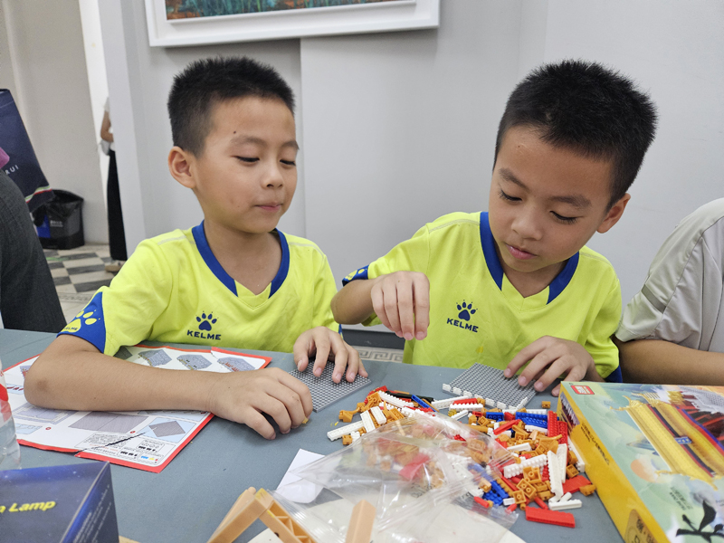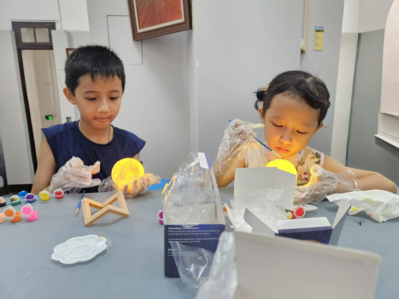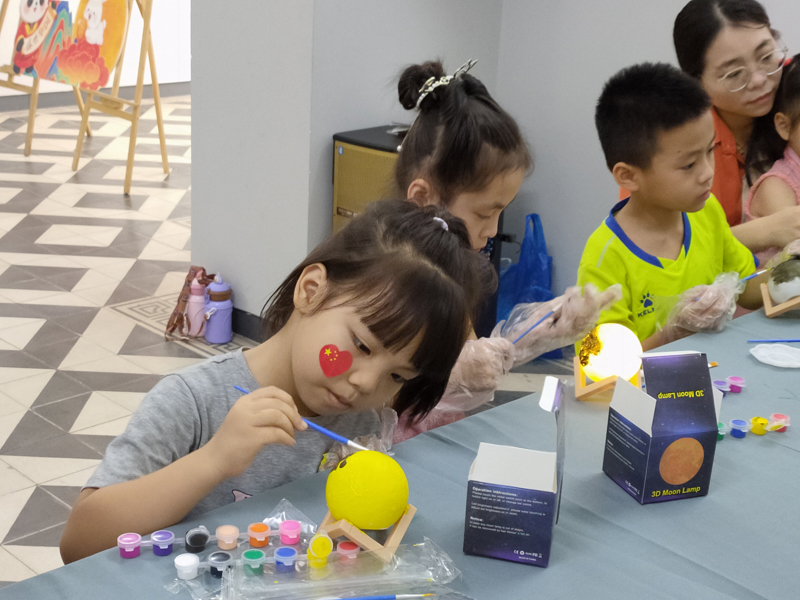 活动中的“手绘月球”环节,巧妙地将传统文化与现代创意相结合,激发孩子们动手动脑的能力,画出自己心中最富有神秘色彩的月球。接着,孩子在老师的指导下在团扇上描绘贺国庆和迎中秋的景象,并书写与国庆中秋相关的诗句,每一幅作品都充满童趣。此外,小朋友们还在家长的助力下完成了由200个多零配件组成的“太和殿”建筑模型拼砌,既益智又富有挑战性。