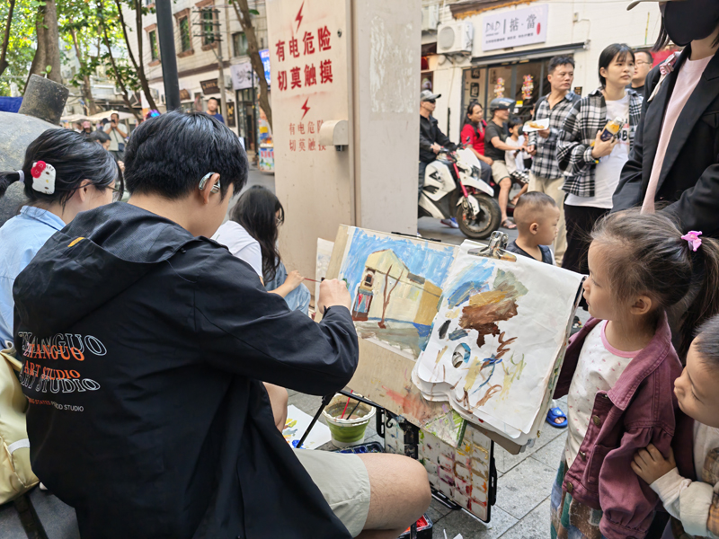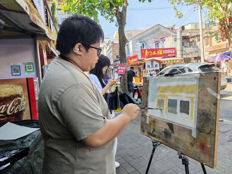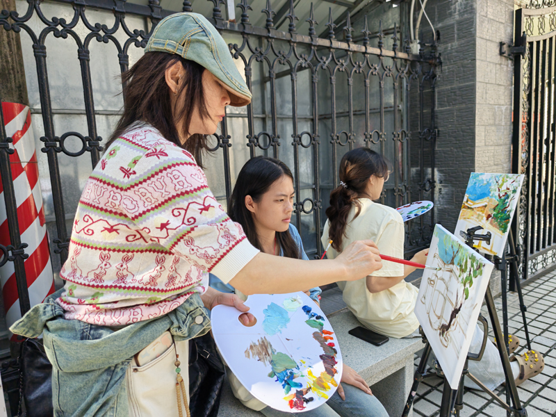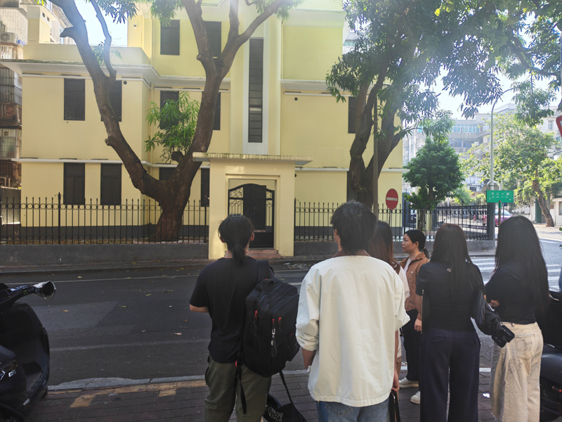 一大早,研学队伍在赤坎老街集合,博物馆的工作人员通过生动讲解,为同学们梳理广州湾历史脉络和各处建筑的独特价值,为创作筑下基础。随后,同学以画笔对话:或用简洁线条捕捉宁园、森园的风骨轮廓,或借厚重油彩渲染飞机楼的岁月感,还有以清新水粉勾勒广州湾商会会馆的雅致,用灵动水彩展现法华学校的别样韵味。