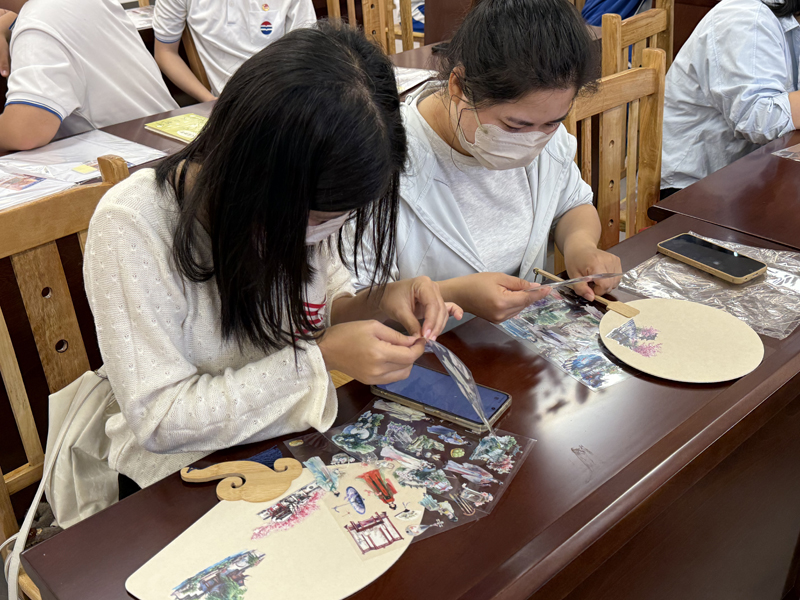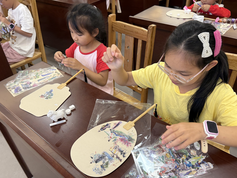 配合清明时节春和景明的特点,活动安排了制作扇面春景图的环节。大家在素面扇上粘上“四时有序”之春景贴纸,不一会儿一幅幅生机盎然的春日景象图就跃然纸上,花红柳绿、山涧清泉,很是应景。